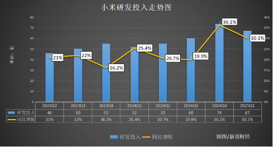 在研发方面,今年第一季度,小米研发投入67亿元,同比增长30.1%,预计今年研发投入将达到300亿元。